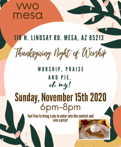 november, 2020 Thanksgiving Night of Worship 15nov6:00 pm8:00 pmThanksgiving Night of WorshipThanksgiving Night of Worship. WORSHIP, PRAISE AND PIE, OH MY! Event Details Event Details Time(Sunday) 6:00 pm - 8:00 pm CalendarGoogleCal